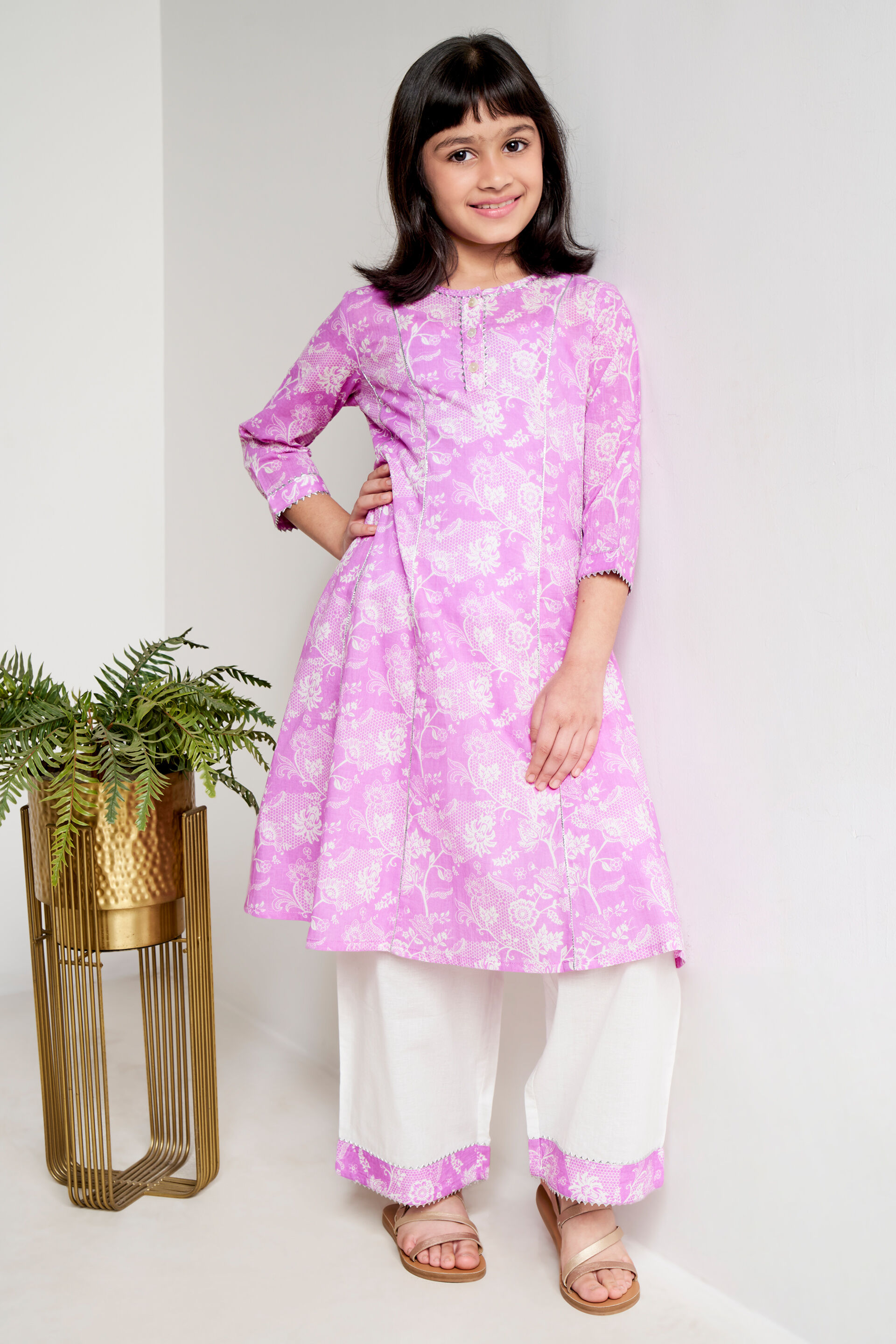 Upgrade her ethnic wear wardrobe with this elegant and dainty lilac kurta set for girls from Global Desi. Crafted from the finest cotton fabric, this set comprises an A-line floral printed kurta with silver detail, a round neck and three-fourth sleeves along with a straight-fit coordinating bottom. Elevate this ensemble with ethnic gold earrings and coordinating sandals.