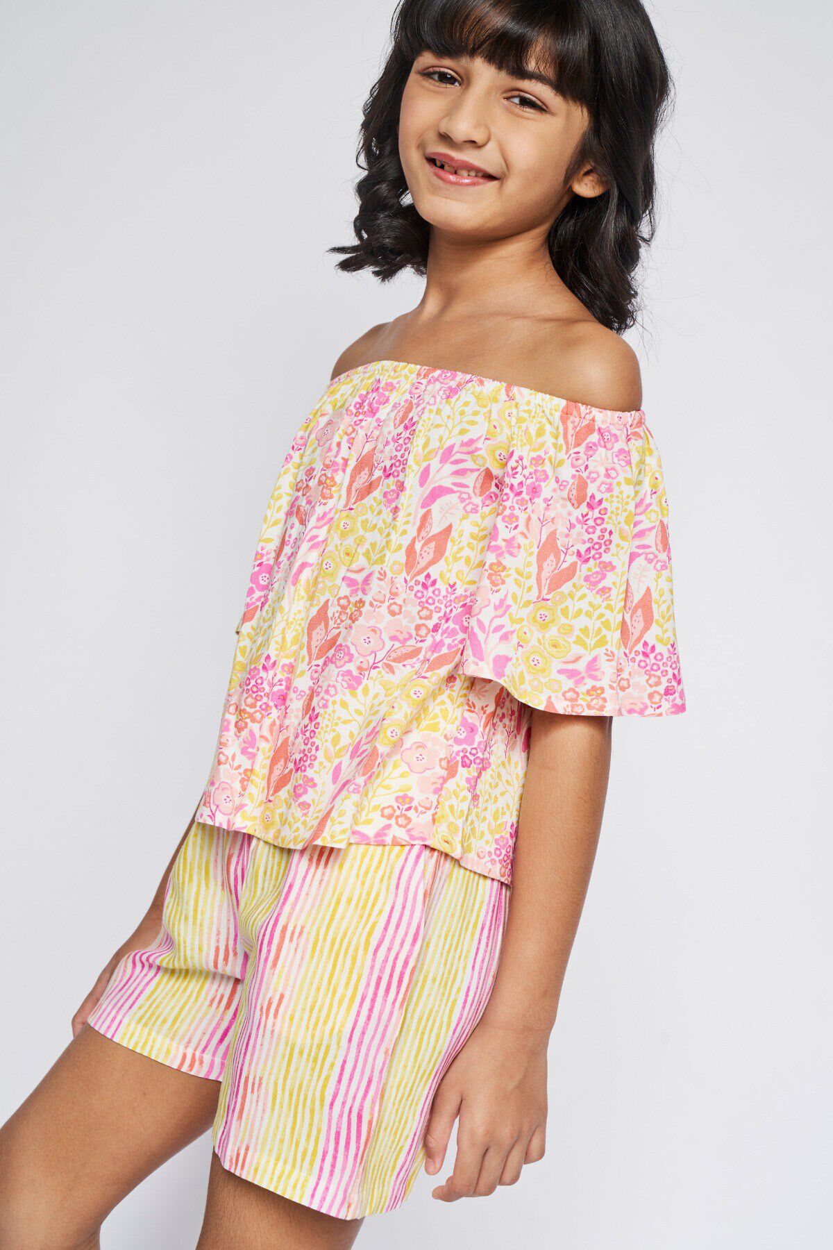Get summer ready with this relaxed and chic printed top and shorts set for girls from Global Desi. In a voguish watercolour floral and stripes print, the top features a gathered neckline and short bell sleeves in floral print and the shorts are striped. Style this trendy set with colour coordinating counterparts to make repeating more interesting. Complete with white or nude sandals or sometimes sneakers or make her playing around more fun.