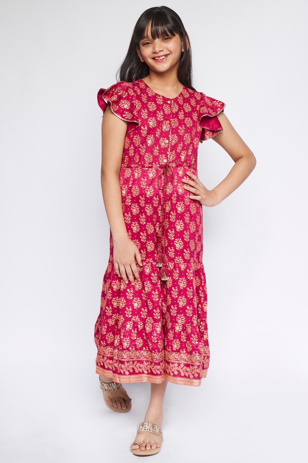 Get your darling daughter festive ready this wedding season with this gorgeous printed jumpsuit for girls from Global Desi. Beautified with floral motif iterations in gold foil, this jumpsuit is crafted from breathable fabric with frilled short sleeves and tiered frilled three-fourth flared bottoms. The drawstring dori at the waistline is to give the contour a better fitted look. Stylise this jumpsuit with ethnic gold earrings and juttis.