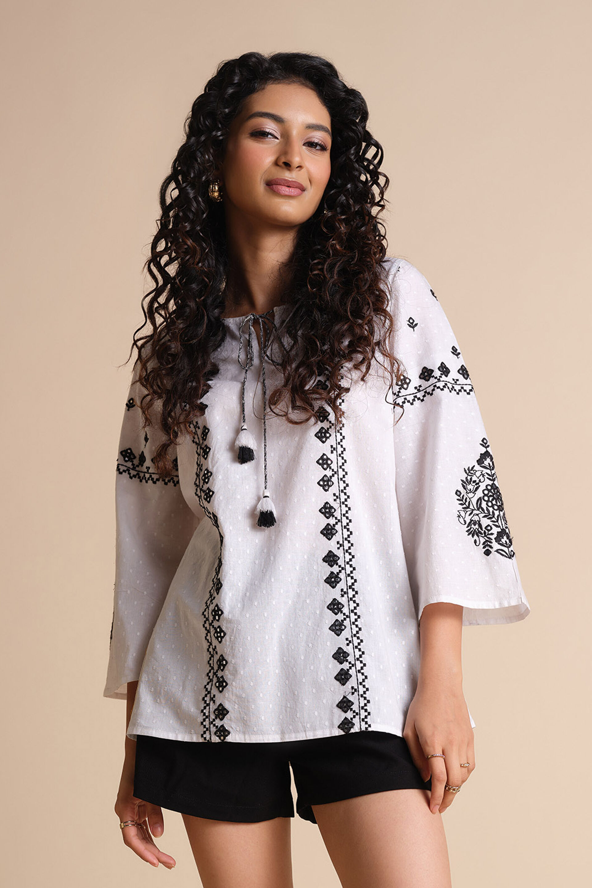 Featuring India-inspired embroidery all over, this elegant top is perfect for your daytime or weekend looks. Featuring three-quarter bell sleeves and a round neck, this top is crafted in a cotton fabric and comes with a tie-up detail on the neckline. Style it up with shorts & boots or black pants & heels.