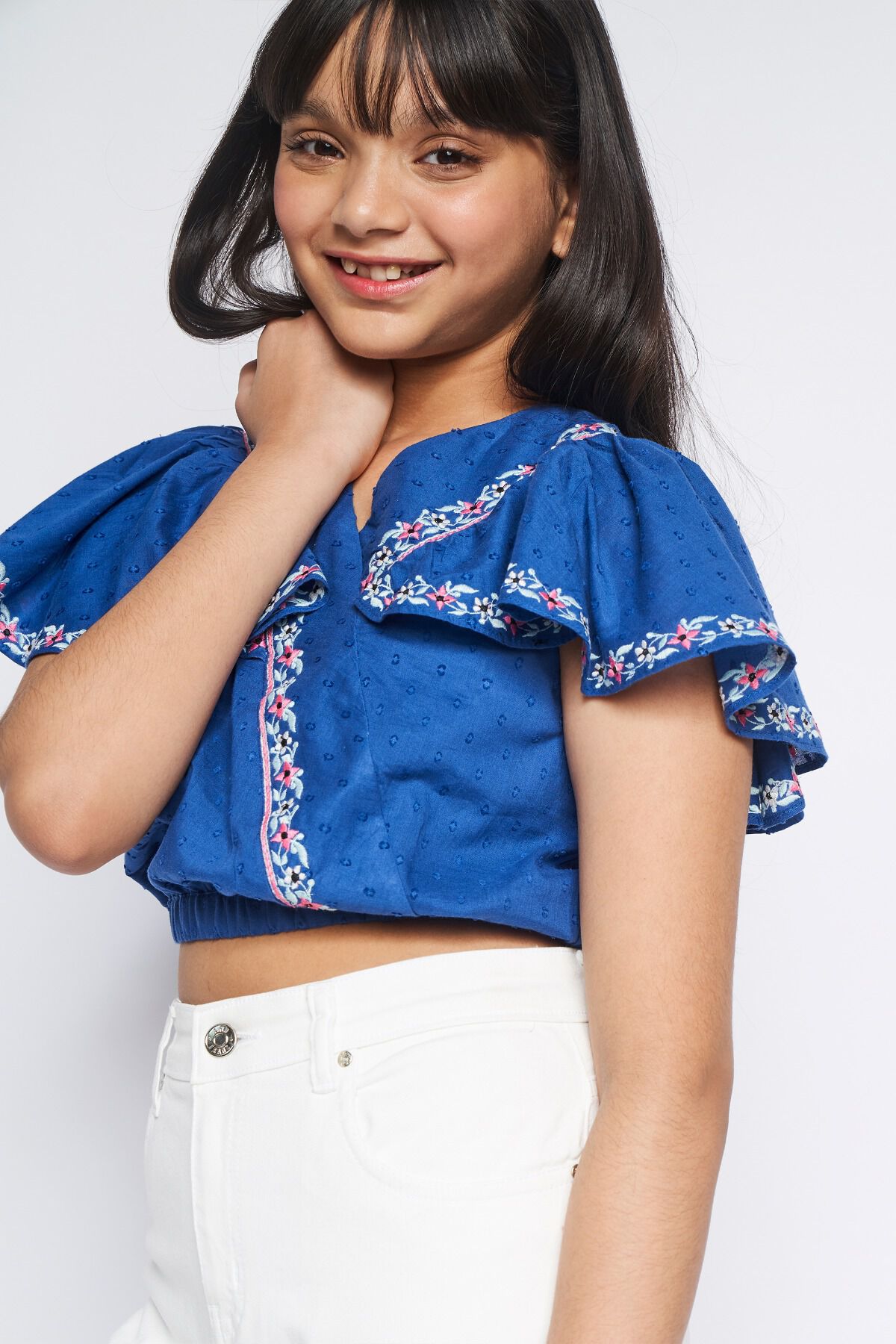 Dress her up like a doll for the next birthday party with this adorable and urban-chic crop for girls from Global Desi. Crafted from soft cotton fabric, the top features floral embroidered frilled sleeves and a V-neck. Pair this top with white jeans and colour coordinating sandals. Throw in some accessorise to amplify the ensemble.