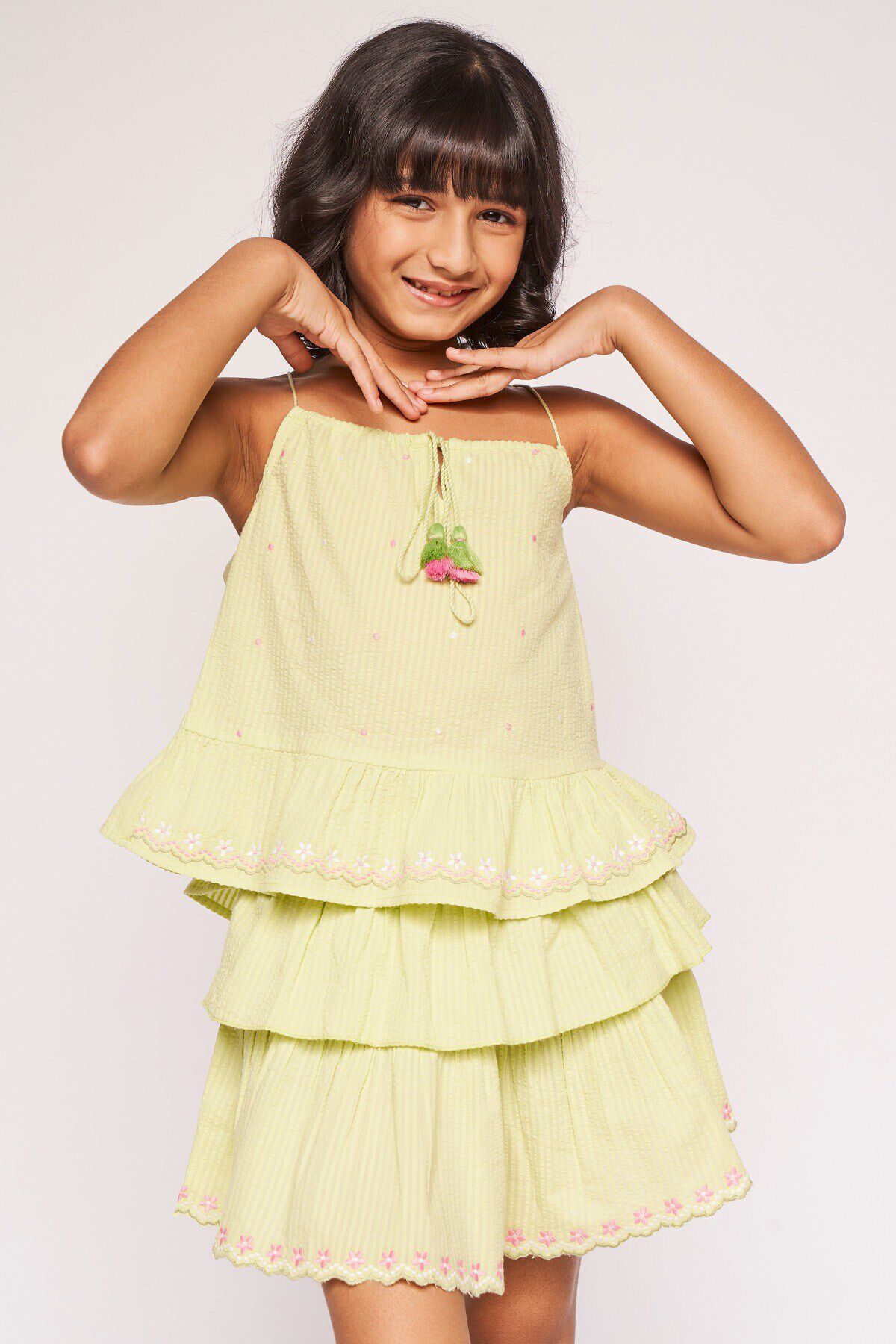 Get her summer beach party ready with this cooling mint green peplum top and skirt set for girls from Global Desi. Made from good quality seer sucker cotton fabric, this set features a peplum top with spaghetti drawstring straps and floral embroidery detail and a frilled flare short skirt with floral embroidery detail at the hemline. Pair this cute set with comfy sandals and beaded necklace