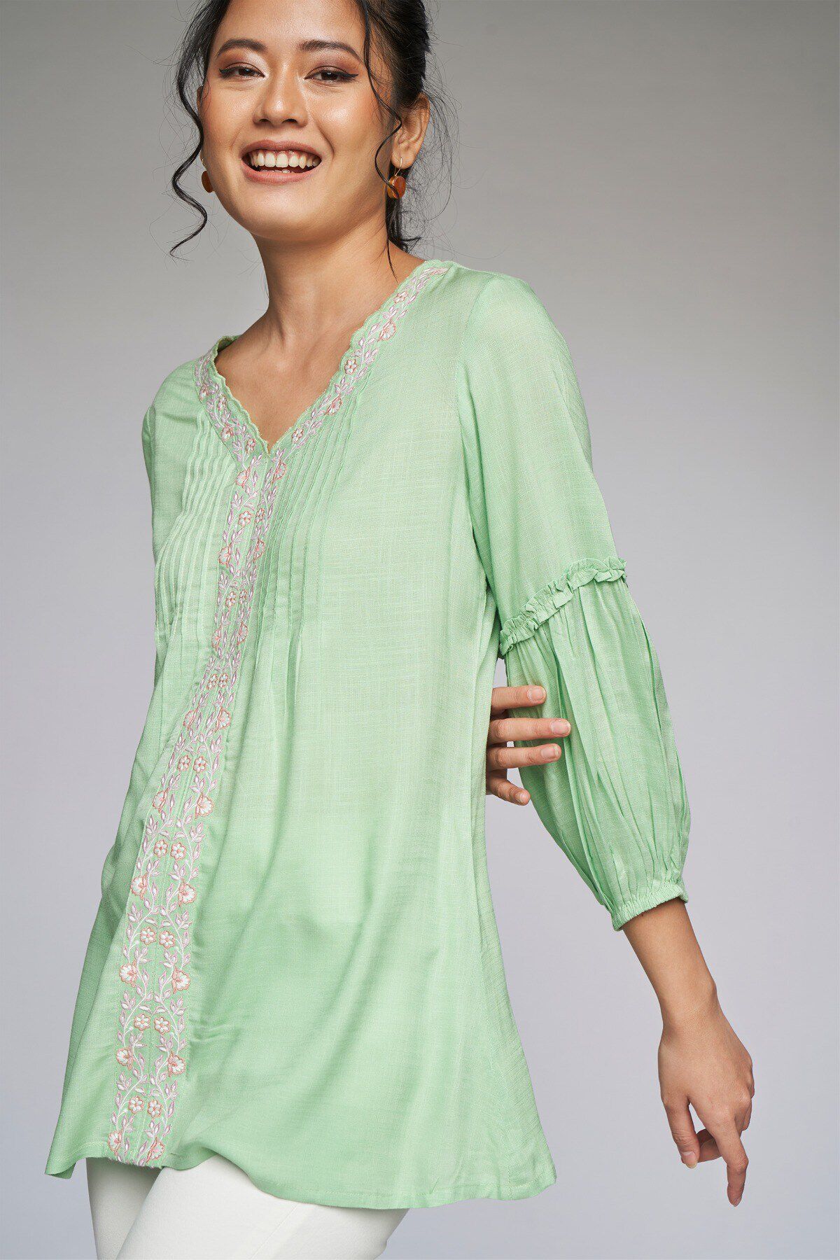 Look the most fashionable in the next work meeting with this elegant and chic top for women from Global Desi. The design features balloon sleeves with pleated detail and a V-neck with floral embroidery running through the placket. Pair this casual top with a range of trousers and dainty earrings or studs and flat footwear.