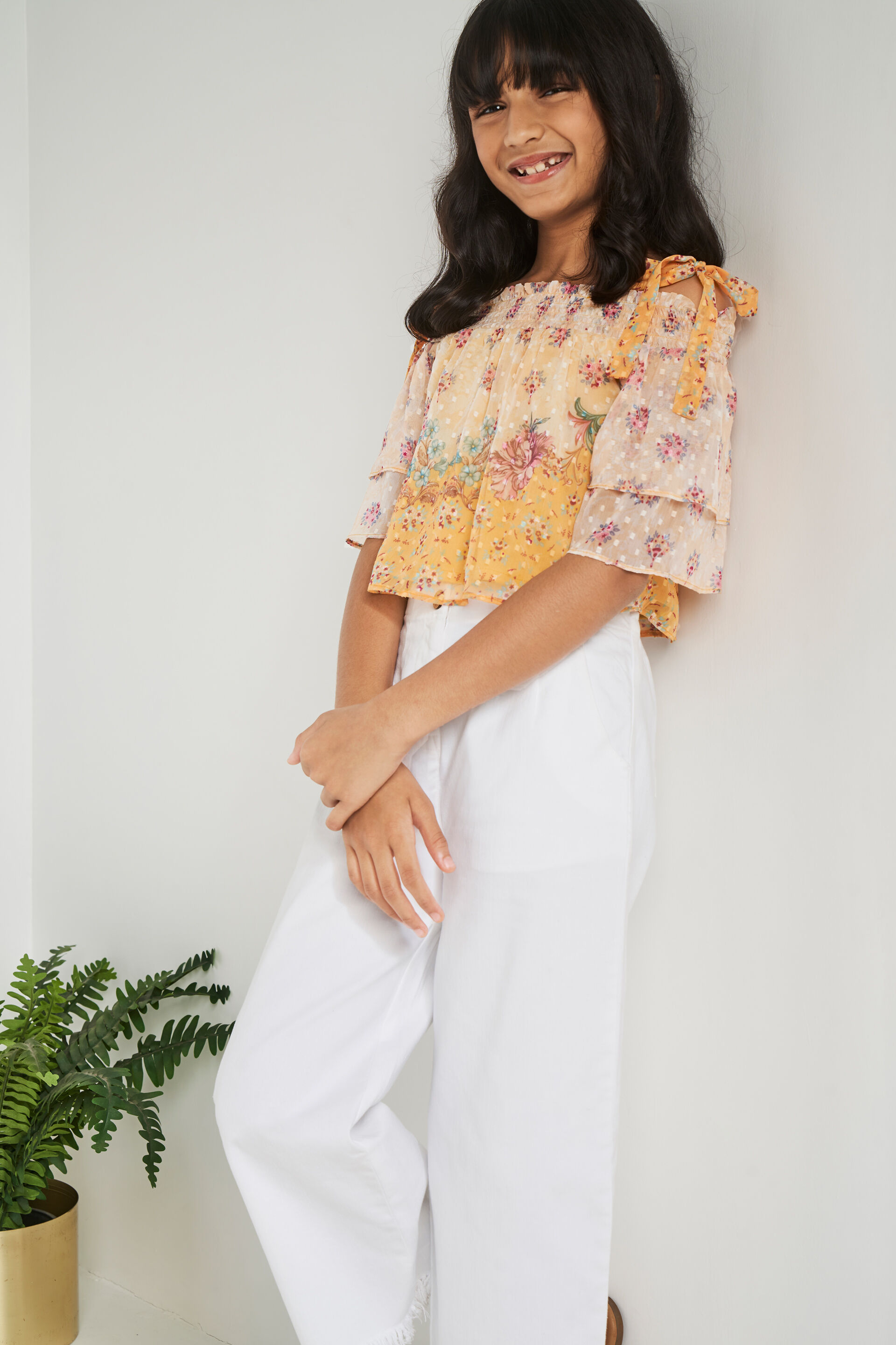 Keep her casual wear days at school quirky and fun with this yellow printed top for girls from Global Desi. With floral motif iterations, this top features cold shoulders with frilled sleeves length. Pair this cute top with white wide-leg white jeans and comfy sandals
