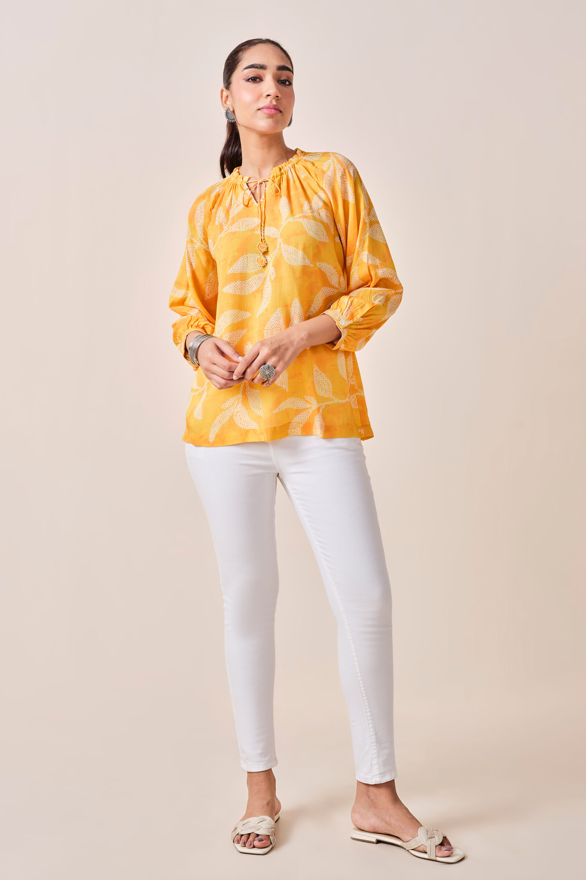 This breezy top features a leaf print all over with gatherings at the neck and a dori tie-up in the front. Its laid back silhouette makes it a great pick for a hot day out. It's crafted with 100% viscose.