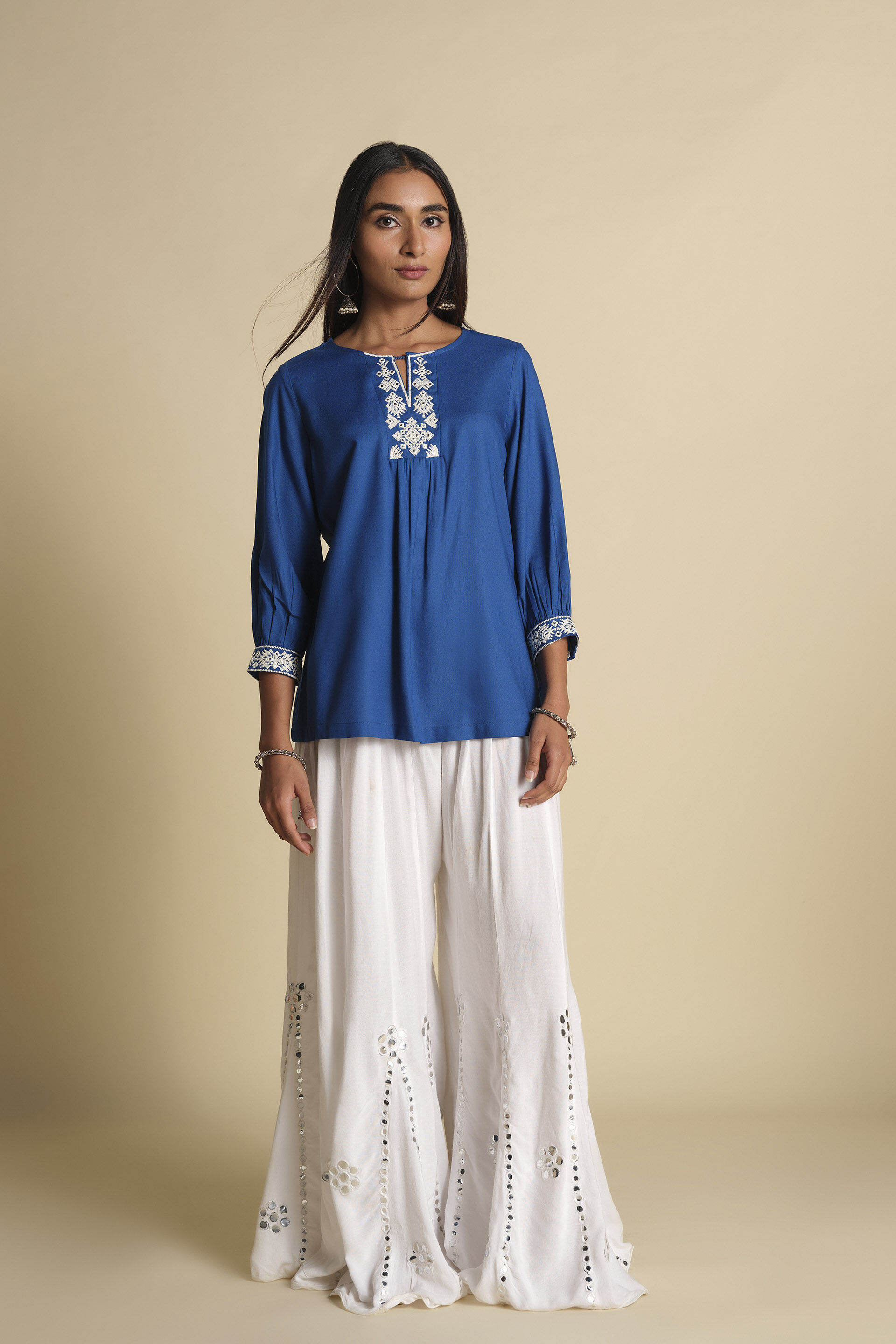 A bright top that gives a run to all your blues. This top comes with cuffed-sleeves & embroidery details making it perfect for wearing all-day long. Crafted from soft & breathable viscose for a lightweight & effortless feel.