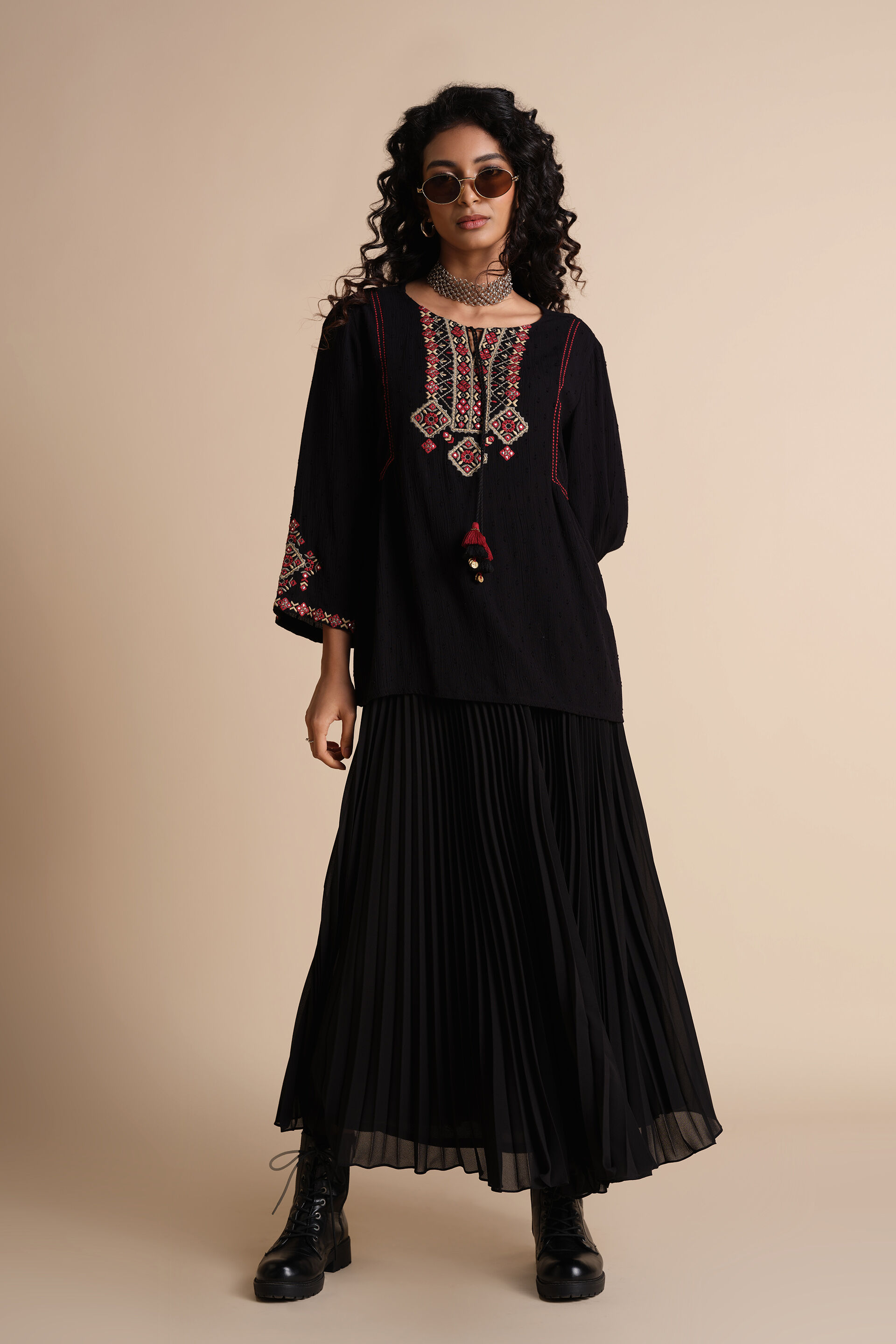Elevate your weekend looks with this India-inspired top. Crafted from soft & breathable viscose, this top features beautiful mirror embroidery on the neckline & sleeves. With its chic & relaxed vibe, you can pair it with white bottoms, kolhapuris & pom pom jewellery.