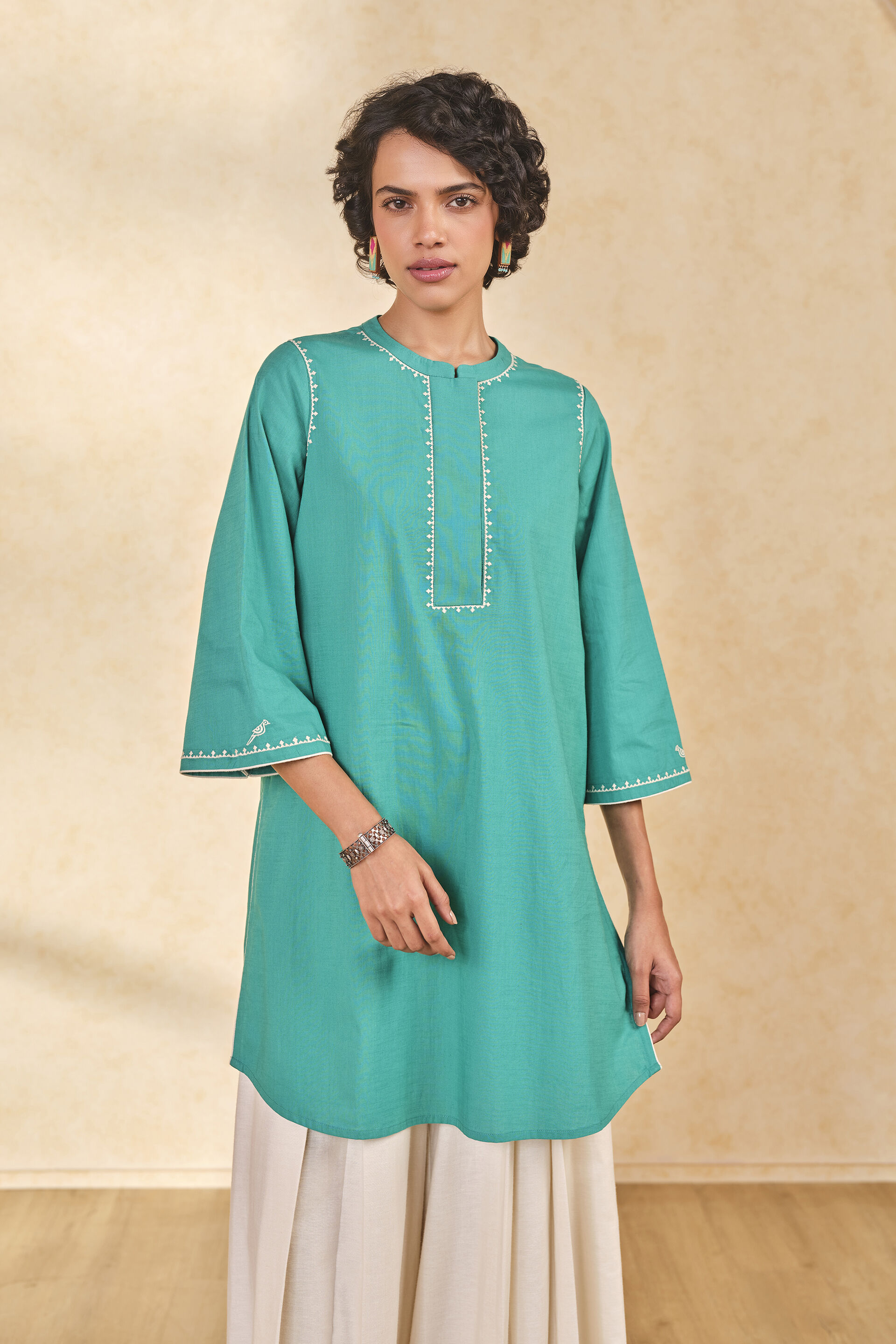 Wrap yourself in comfort as you wear this blue tunic. Made from cotton, it features a contrast embroidery detail at the front and sleeves. Perfect for casual outings.