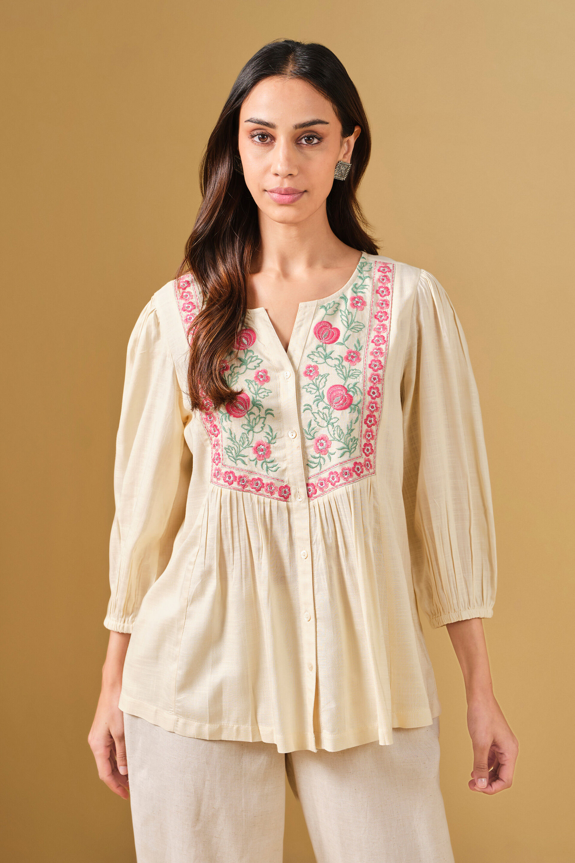 Embrace the onset of summer with this comfy top. Crafted using 100% biodegradable viscose, this top features floral embroidery along the neckline with a buttoned placket and cuff sleeves for the perfect summer look!