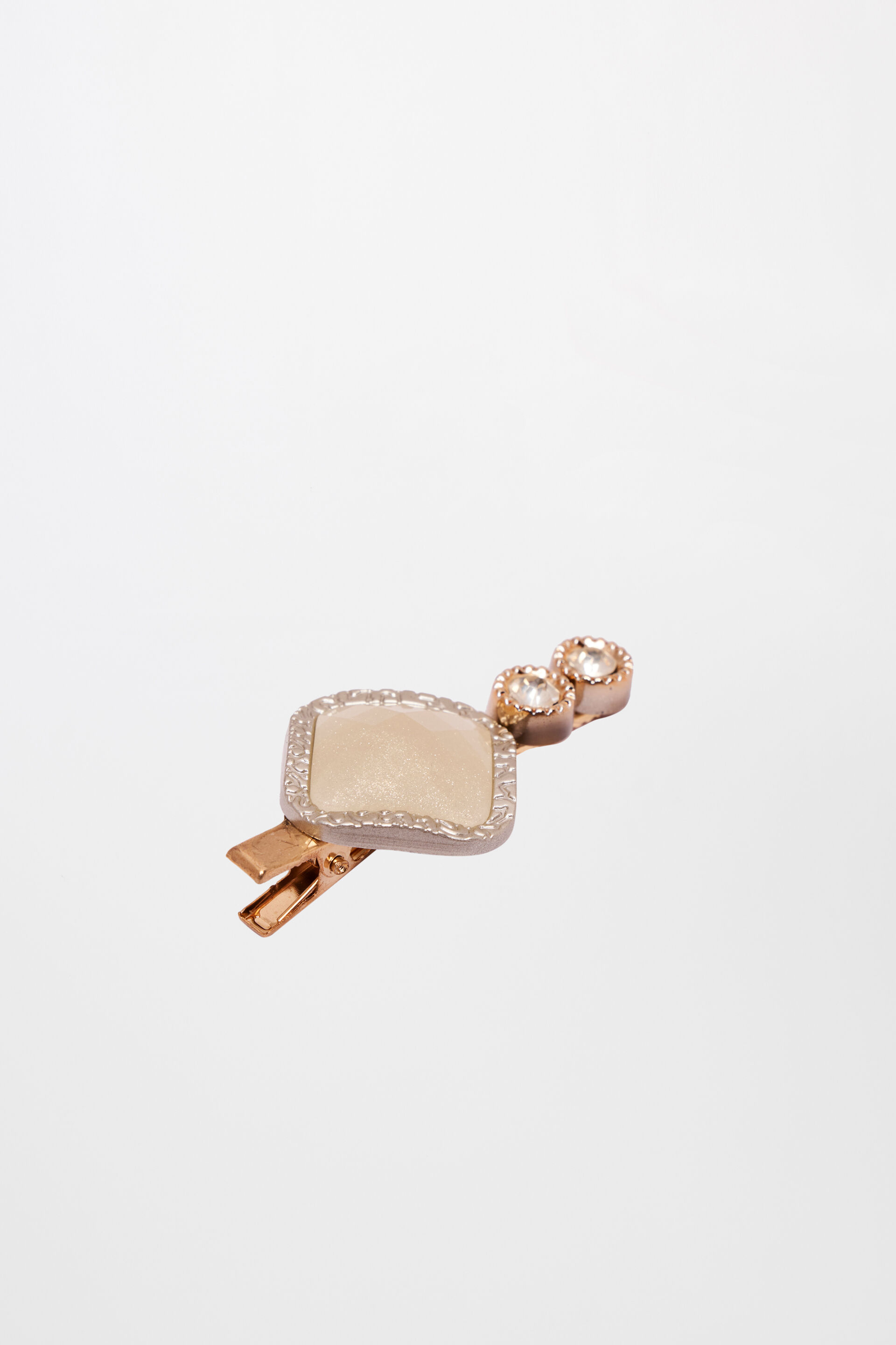 A stunning clip to elevate all your complementing ensembles from Global Desi. Fashioned in a gold metallic base adorned with diamond studs and a white shimmering disc placed adjacently on top with a spring clasp that holds your hair stylishly. Crafted in an alloy, this clip features great attention to detail and will surely catch the attention. It adds elegance to your ensemble. Keep these in a ziplock, away from moisture and long sunlight exposure to avoid any kind of tarnish. Do not spray perfume directly. Manufactured by: Ochre and Black Pvt. Ltd. Plot No R 847/1/1, TTC Ind. Area, MIDC, Rabale, Navi Mumbai, India –400701 Country of origin: India