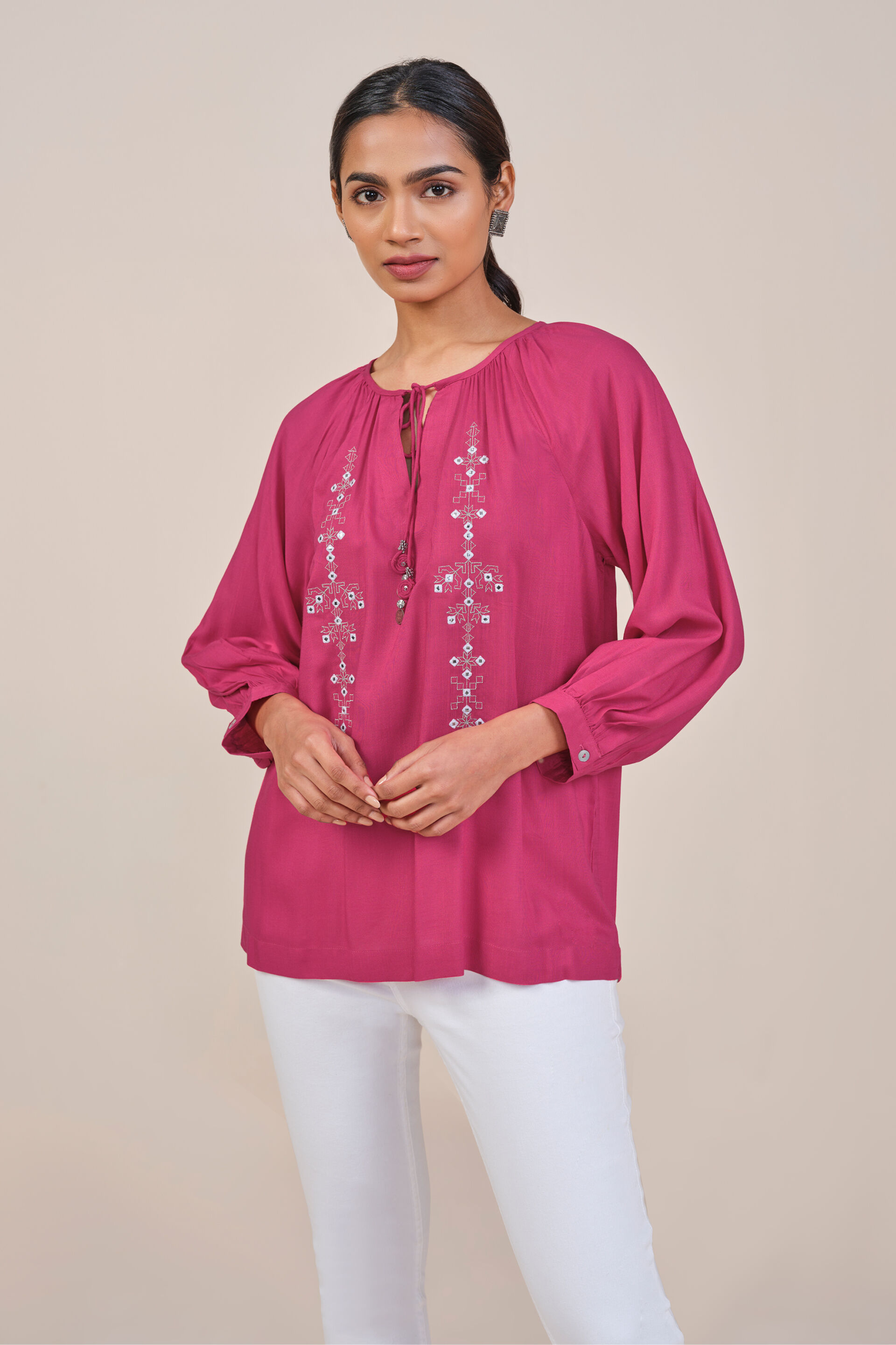 Perfect for making a statement, this bold-hued kurta top features striking embroidery in the centre and an elegant tie up at the neckline. Tt will make for a dazzling fit for you next festivity, when paired with a maxi skirt or palazzos.