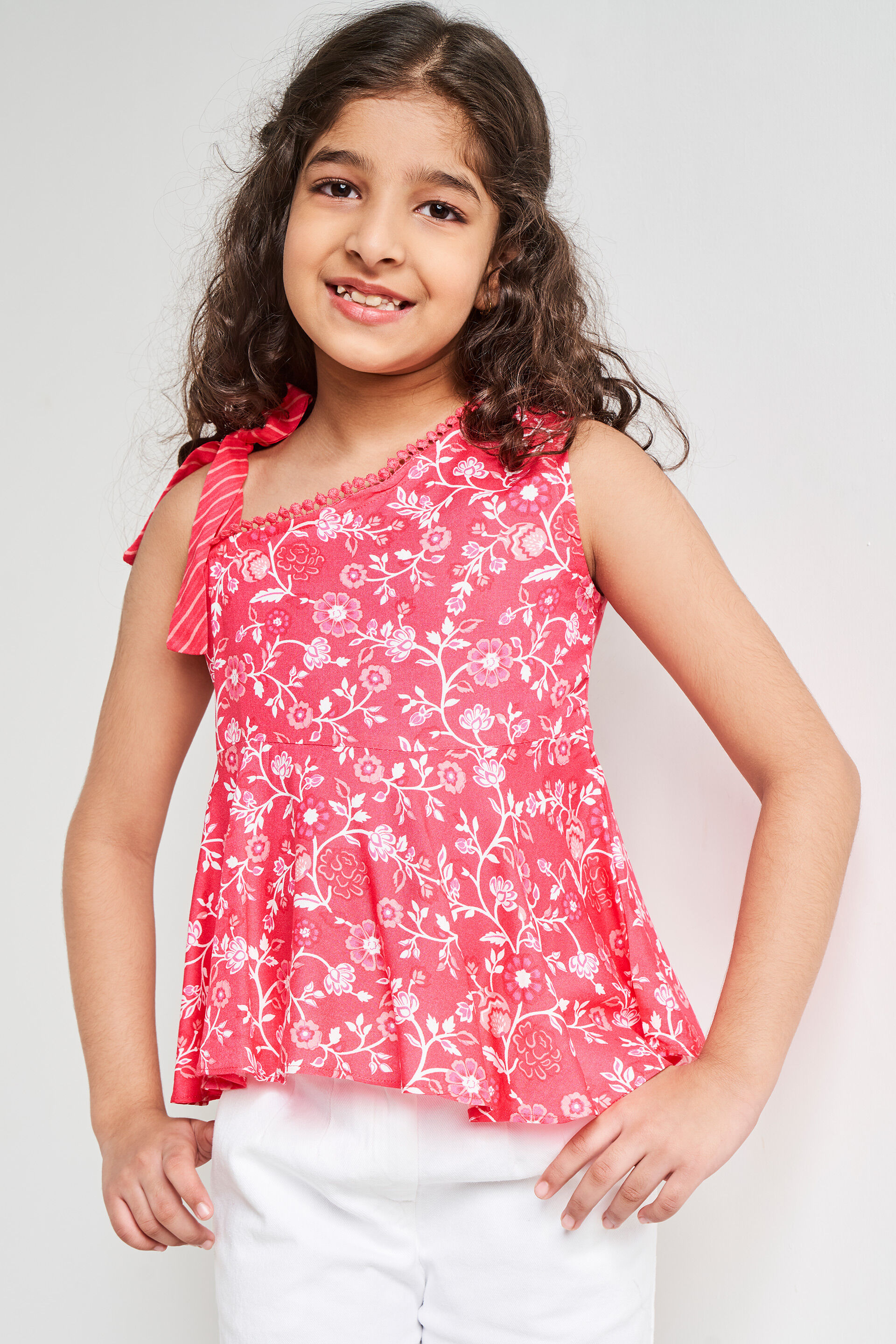 Get her playdate ready with this adorable floral printed peplum top for girls from Global Desi. Crafted from light fabric, this top showcases an asymmetrical neckline and a singular tie-up strap. Style this trendy top with white wide-leg jeans and white or nude sandals or sometimes sneakers or make her playing around more fun.