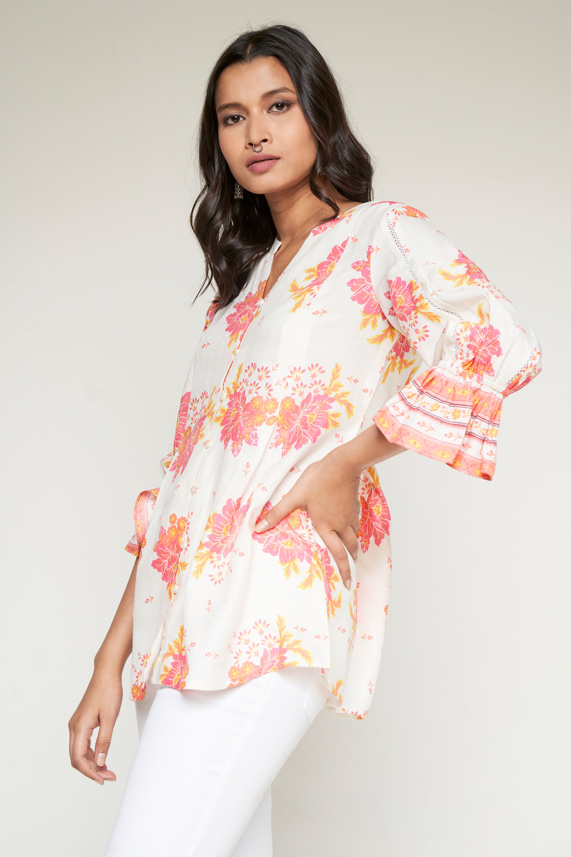 Look the most fashionable in the next work meeting with this elegant and chic top for women from Global Desi. The design features flute sleeves and a buttoned-down bodice with a statement floral print all over. Pair this casual white-pink top with a range of trousers and dainty earrings or studs and flat footwear. The model is wearing size: Top - 'Small'/10 & Trouser - 28