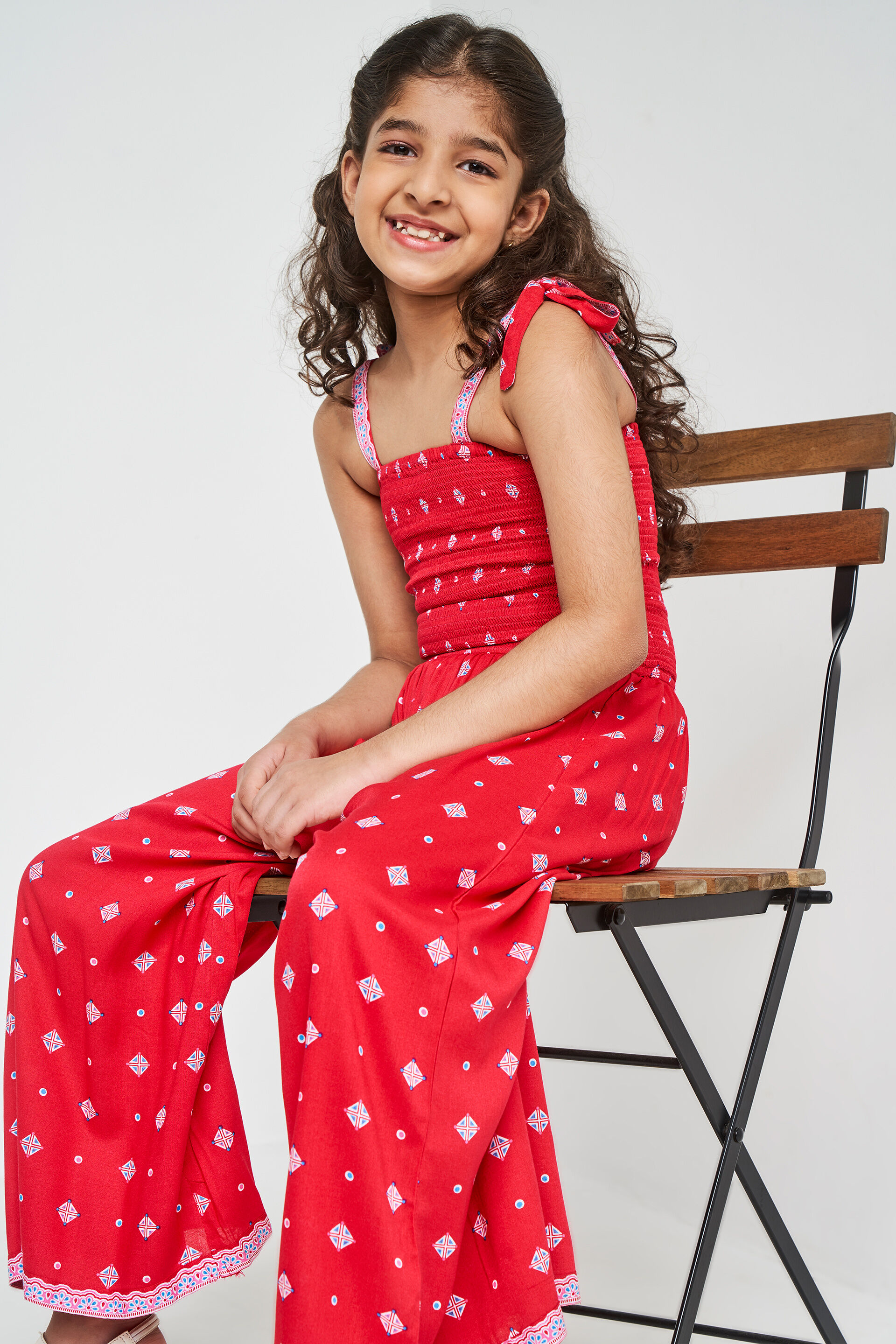 Sleek and stylish is this printed red jumpsuit for girls from Global Desi. Crafted with perfection, this jumpsuit features a smocked bodice with printed tie-up straps and an elongated ankle-length bottom. Pair this chic jumpsuit with dainty studs and comfy sandals.