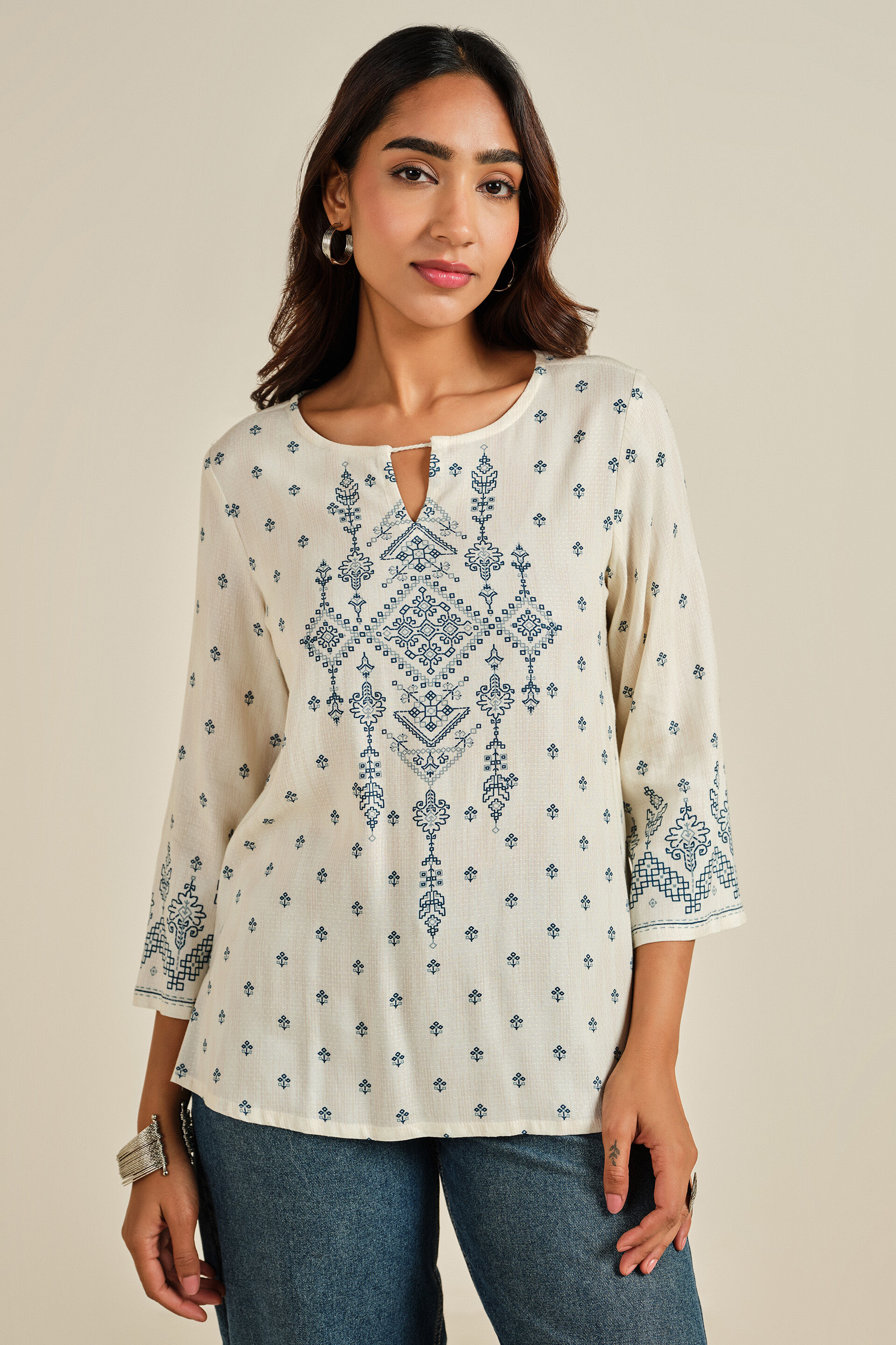 Subtle in nature and exuding an angelic aura, our Rimjhim white tunic features a geometric design. With a round neckline and quarter sleeves, it is loosely woven and perfect for everyday style. Pairing the tunic with loose jeans creates a beautiful look.