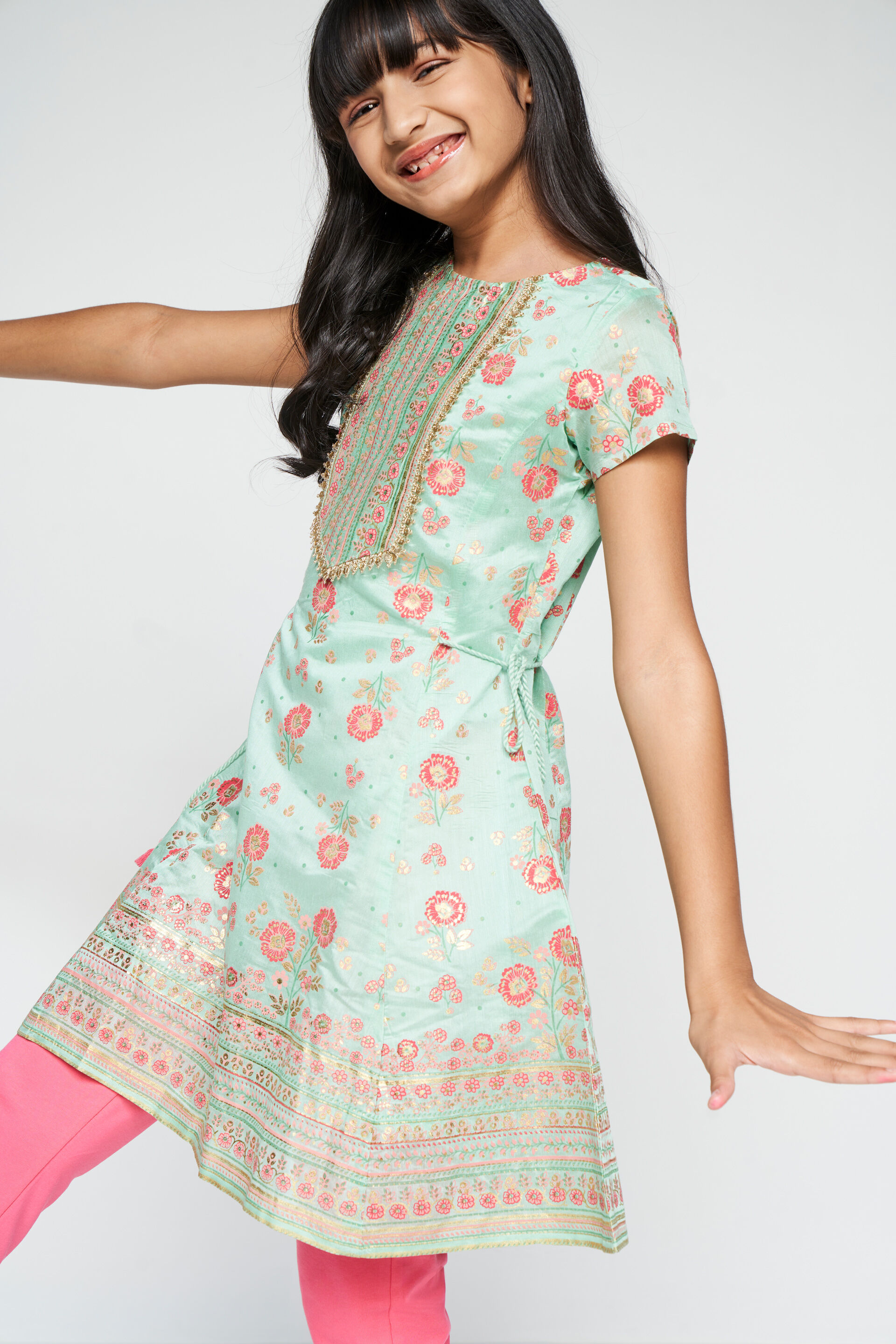 Perfect for celebratory occasions, adorned with an elegant floral foil print. Enhance elegance with ethnic jewellery. Set Incudes: kurta & bottoms