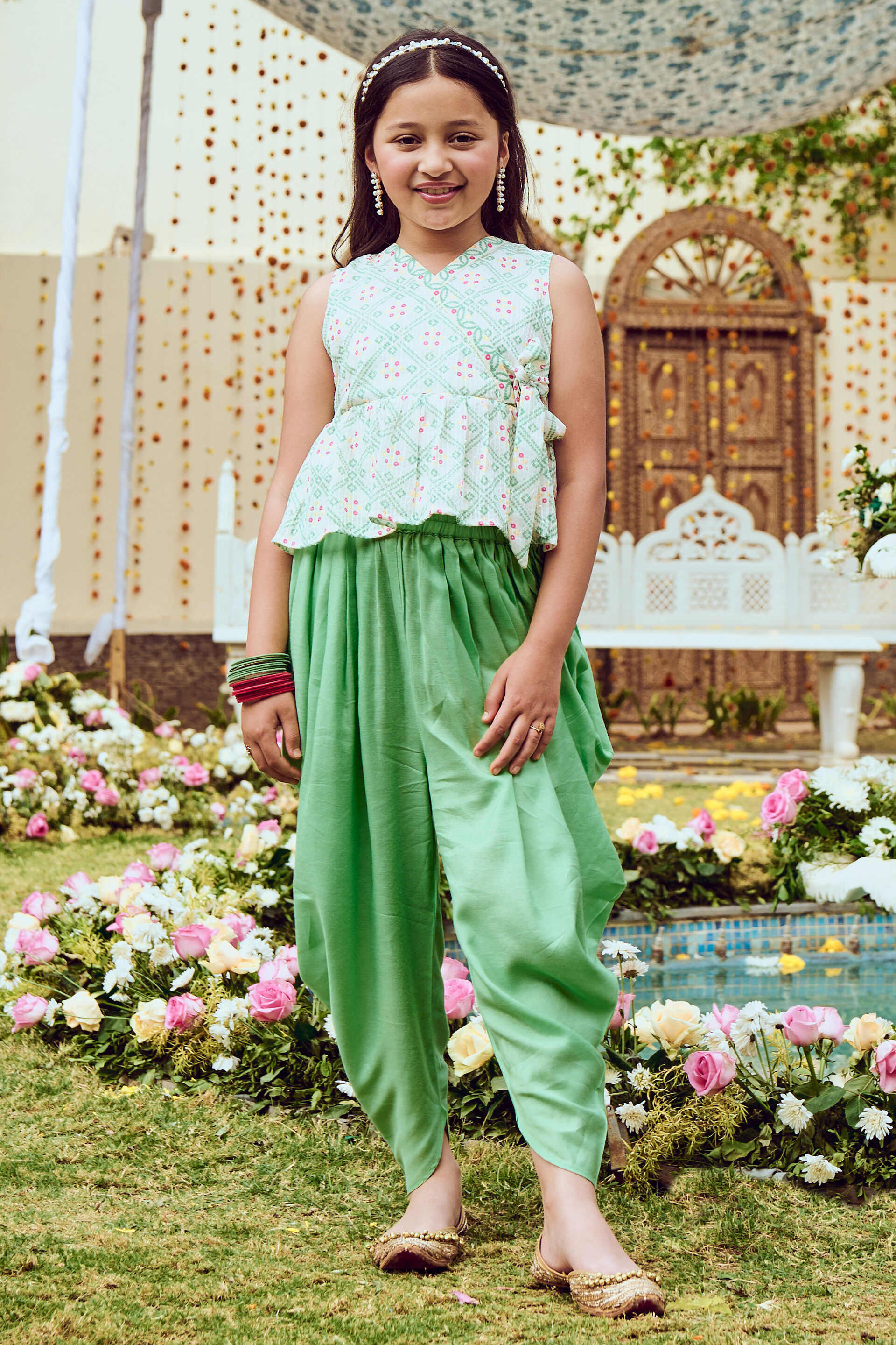 Upgrade her ethnic collection line up with this two-piece set for girls from Global Desi. Giving ethnic a contemporary twist, this uber-cool and trendy set features a Bandhini printed peplum top with crossover neckline and a side tie-up. The bottom is made from plush shantoon fabric in a patiala’ dhoti contour. Stylise this gorgeous green set with ethic dainty earrings and juttis.