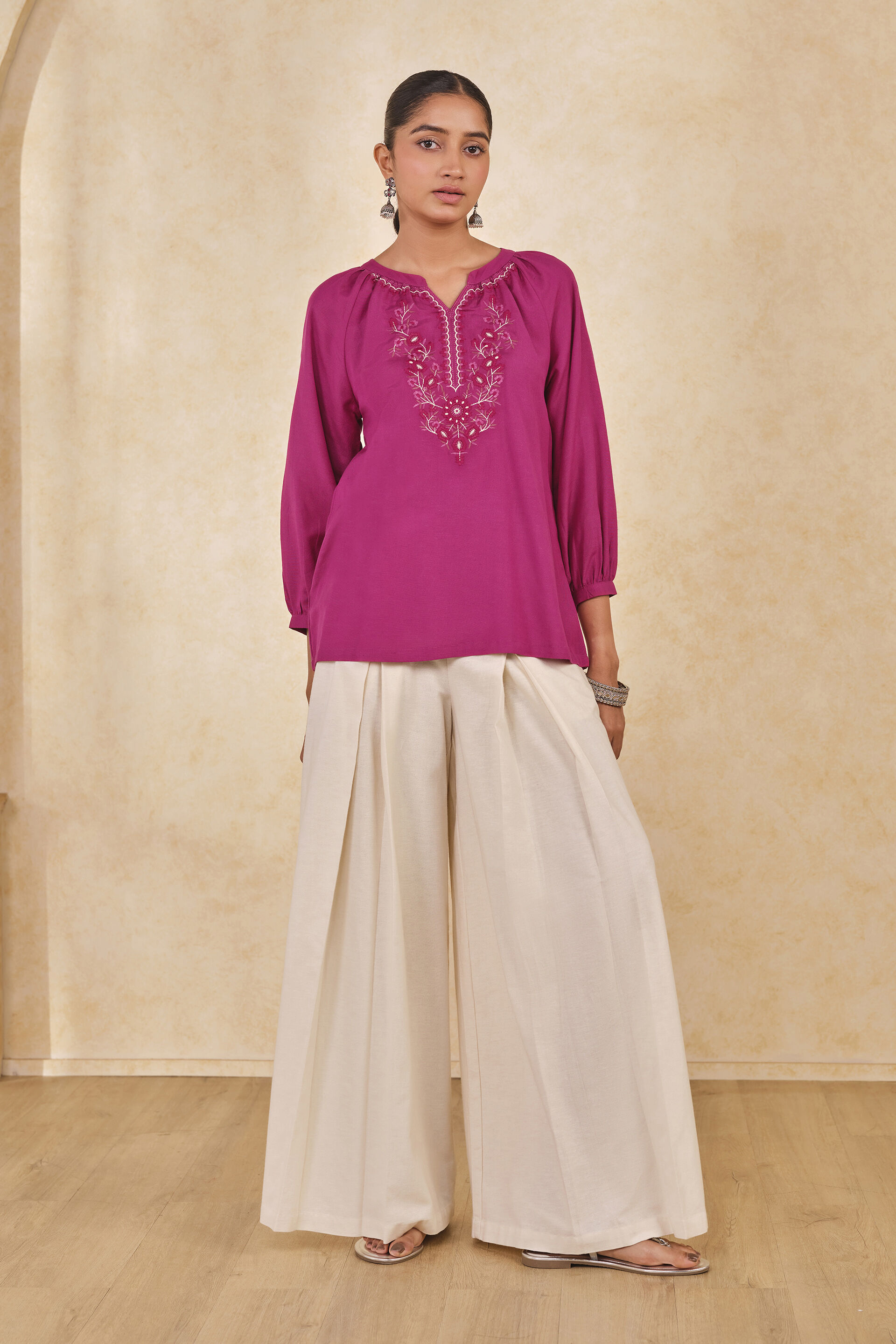 Bloom in style, because florals never go out of fashion! This chic top features vibrant floral embroidery along the neckline, adding a lively pop. Crafted from a soft fabric, this top offers ensures all-day comfort.