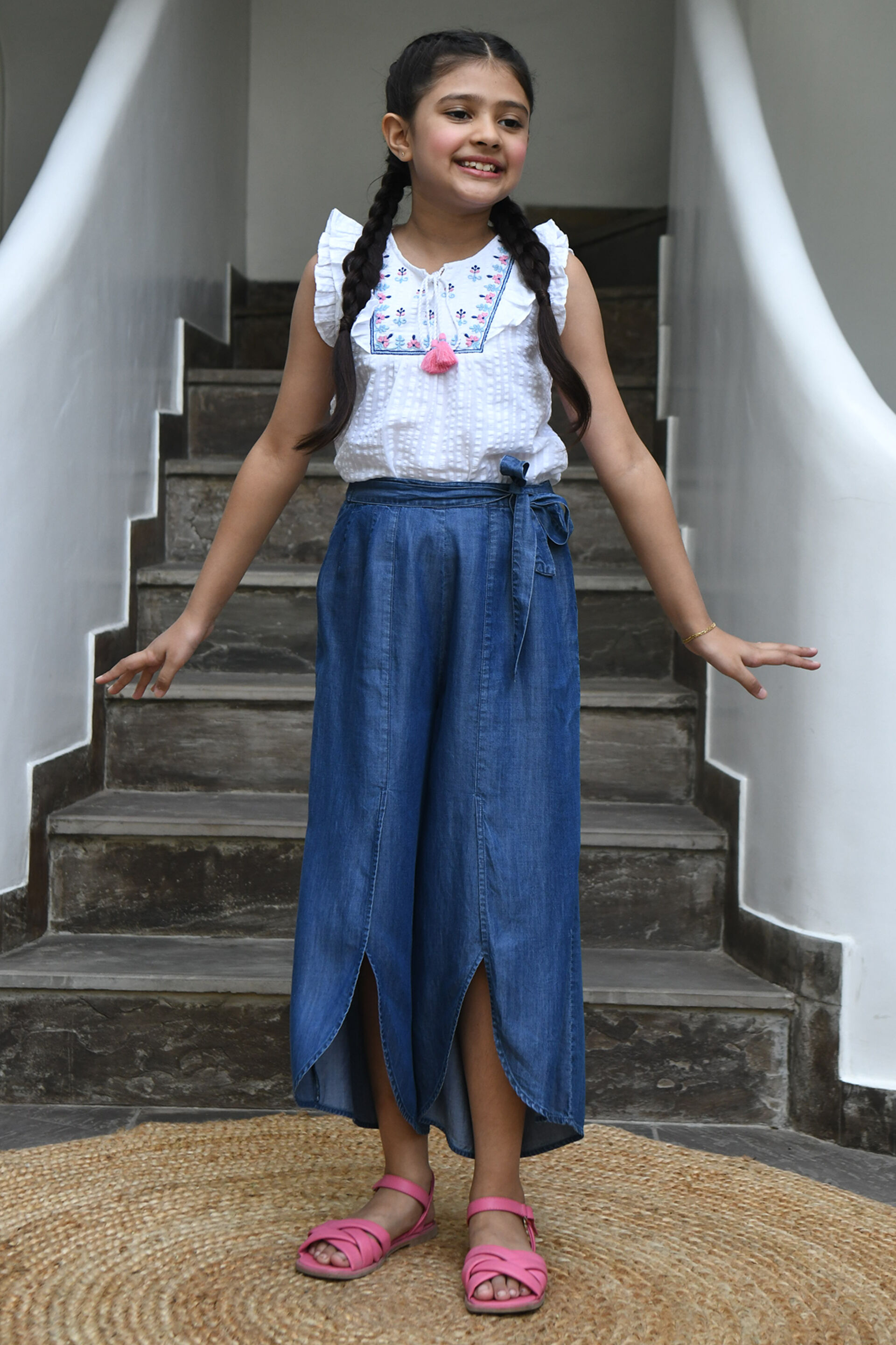 Make casual Sundays quirky and stylish with this elegant floral embroidered top for girls from Global Desi. Fashioned from soft cotton fabric, the design features a straight-fit contour, cap sleeves, and a frilled big yoke with a drawstring at the neckline. Pair it with a range of shorts or jeans. Finish it off with coordinating sandals and a headband. Manufactured by - Ochre & Black Private Limited, Plot No R 847/1/1, TTC Ind. Area, MIDC, Rabale, Navi Mumbai, India –400701 Country of origin: India