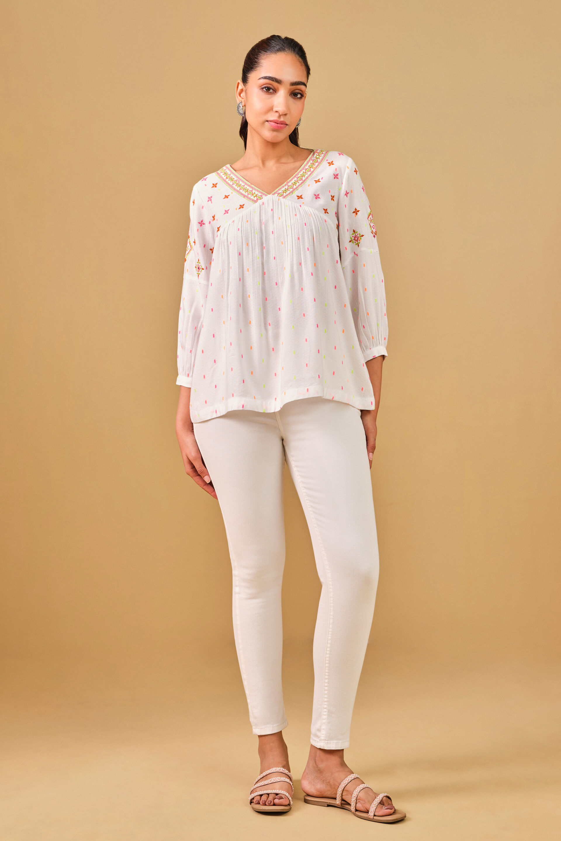 Keep your summer style light and playful with this white top. Featuring colourful embroidery along the neckline, this piece looks great when it’s paired with denims or any dark coloured bottoms!
