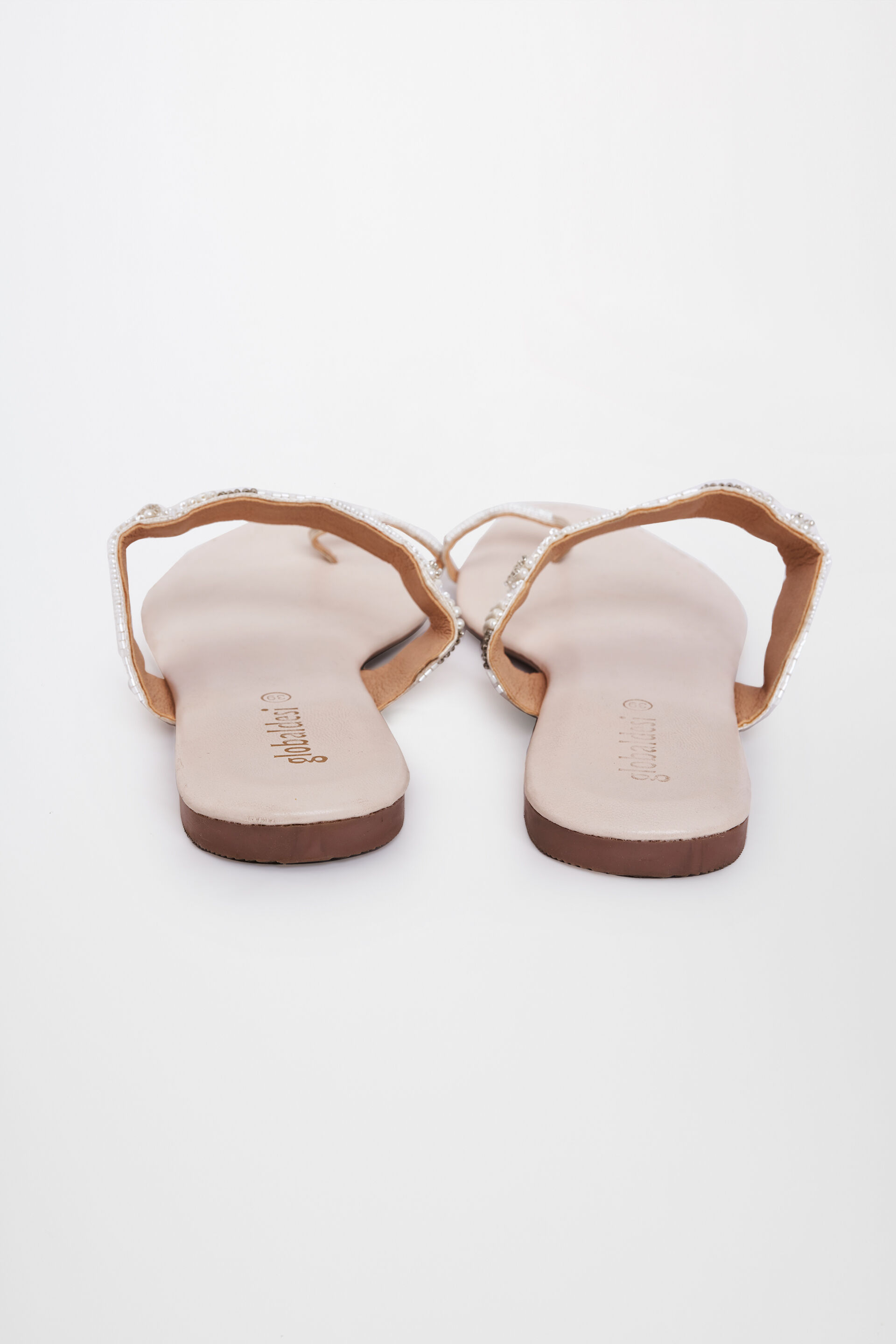 Your traditional kolhapuris are given a contemporary twist. This flat footwear for women from Global Desi is crafted from long-lasting and the softest faux-leather material in white and a comfortable sole showcasing an embellished broad strap and a toe-loop. Stylise these with complementing kurtas or over any complementing ensembles.