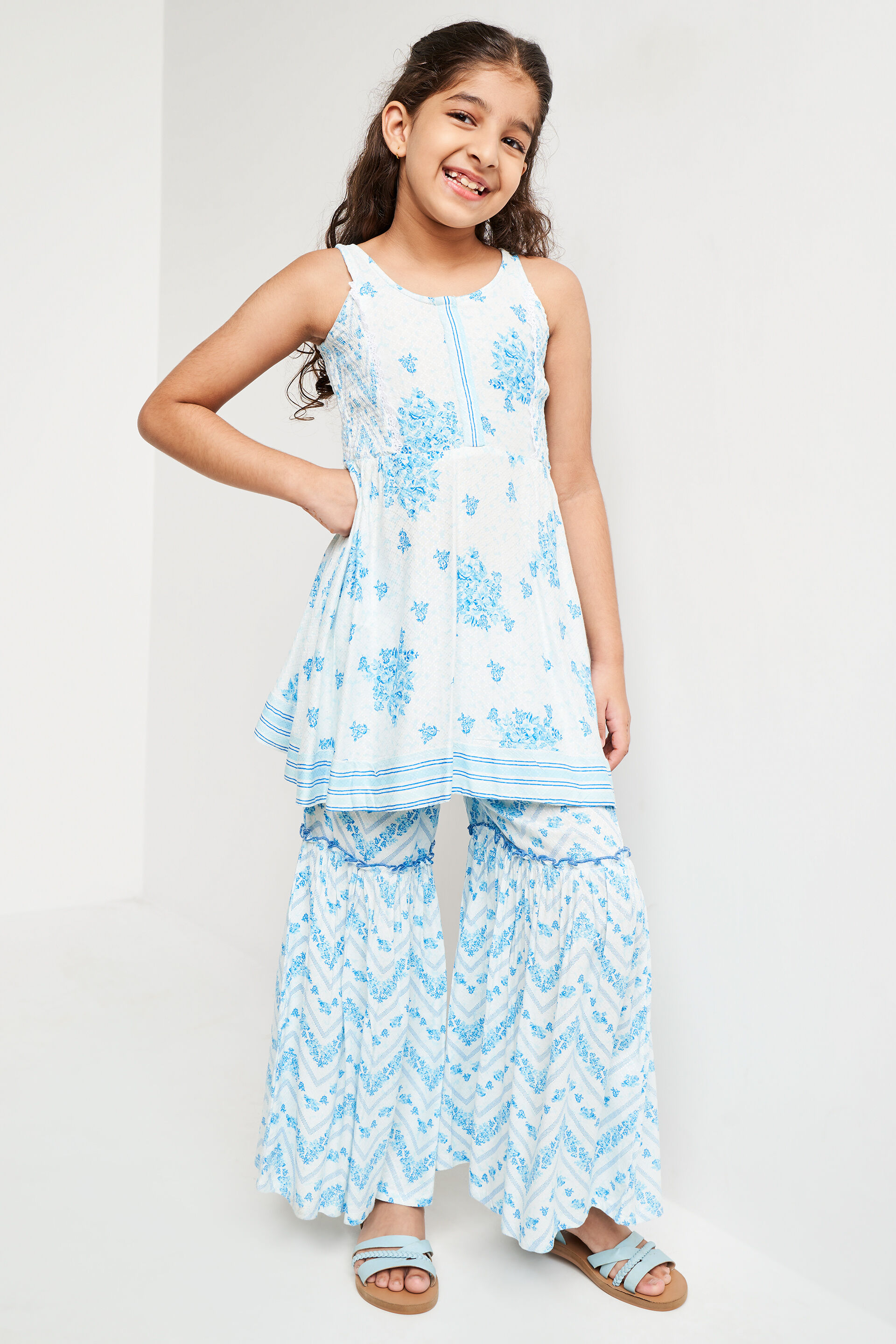 Make your little darling look like an angel at the next festive or wedding party in this two-piece set for girls from Global Desi. This elegant set comprises a floral printed kurta with a sleeveless bodice and a round neckline. The bottom is a floral printed sharara. Elevate this ensemble with ethnic earrings and coordinating flat footwear.