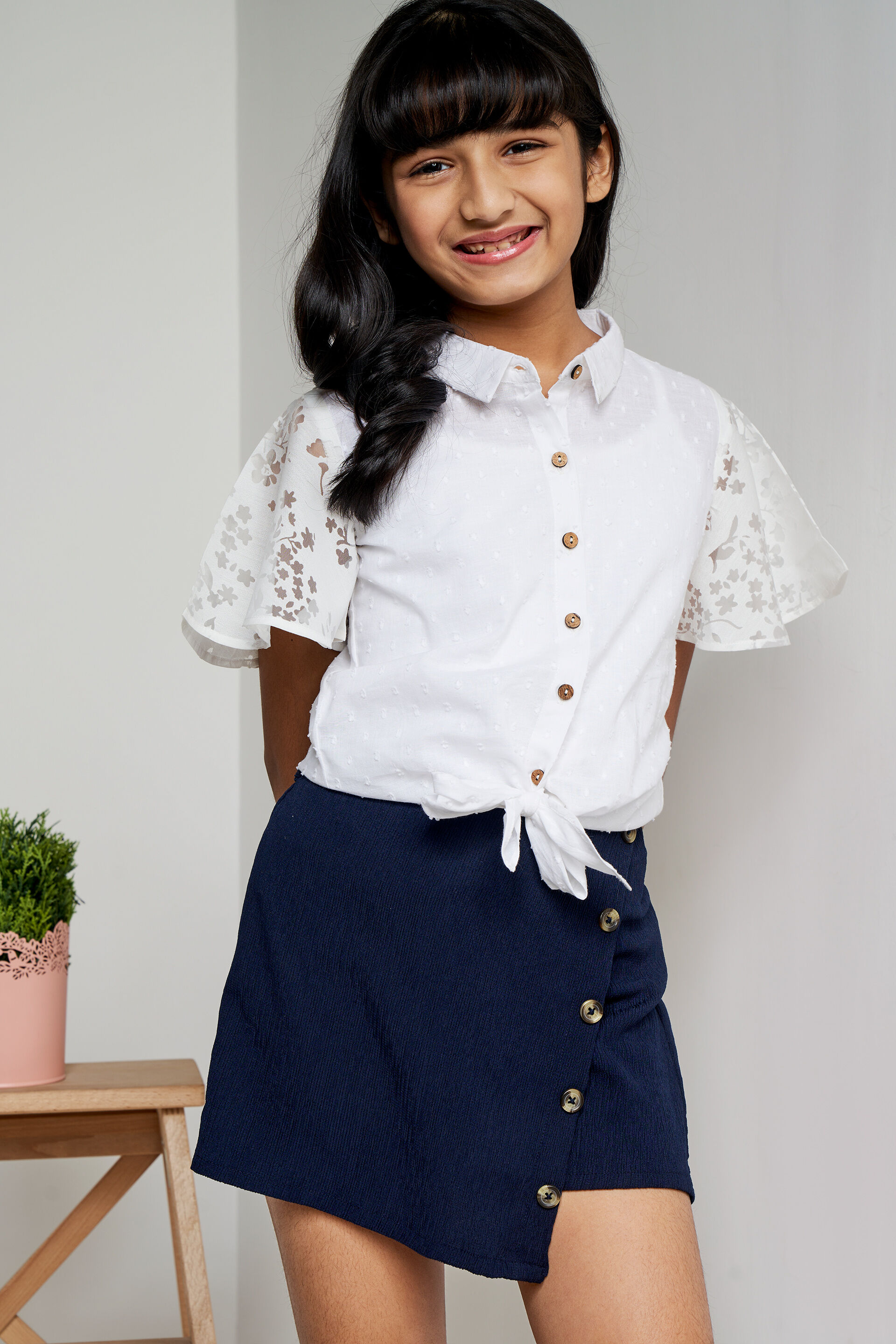 Get her summer party ready with this chic white tie-up shirt for girls from Global Desi. Made from good quality cotton fabric in self-design, the shirt features short bell sleeves and a fabric tie-up belt at the hemline. Pair this cute top with comfy wide-leg denim, sandals and a beaded necklace.