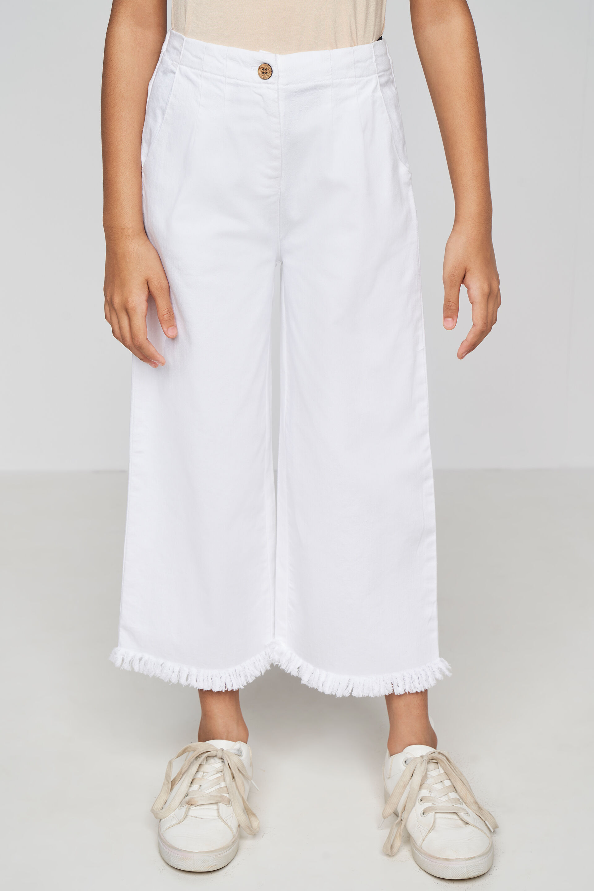 Pump up her summer closet with this stylish pair of wide-leg jeans with a detailed fringe at the hemline. Made from the best quality of cotton, breathable and great for uninterrupted movement with four utilitarian pockets. Stylize these jeans with a variety of fashionable tops or even solid basic T-shirts and with sandals or just sneakers to make running around more fun.