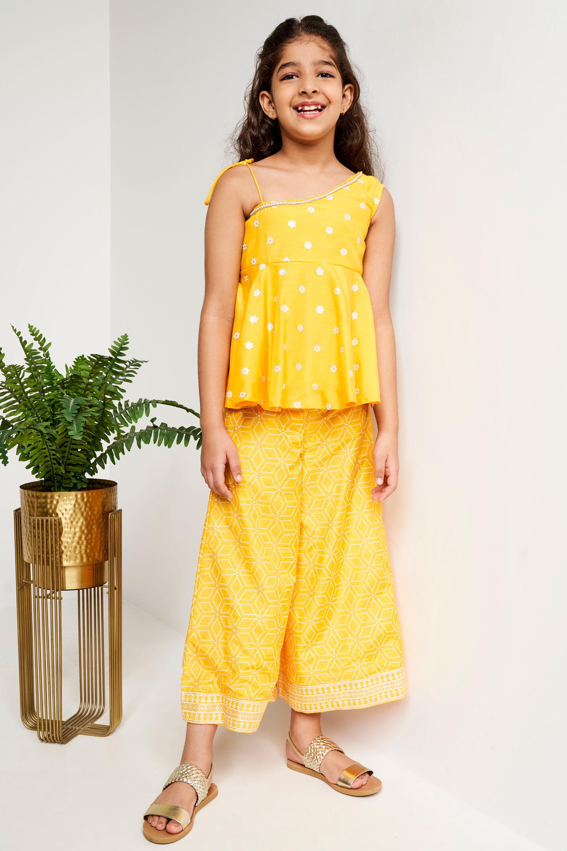 Bedazzle all the eyes at the next festive party and make your girl shine in this elegant palazzo-kurta set for girls from Global Desi. Crafted from plush shantoon fabric, the set comprises a floral printed one-shoulder peplum top with an asymmetrical neckline. The bottom is a floral printed long palazzo, both in a beautiful yellow shade. Elevate the ensemble with ethnic earrings and flat footwear.