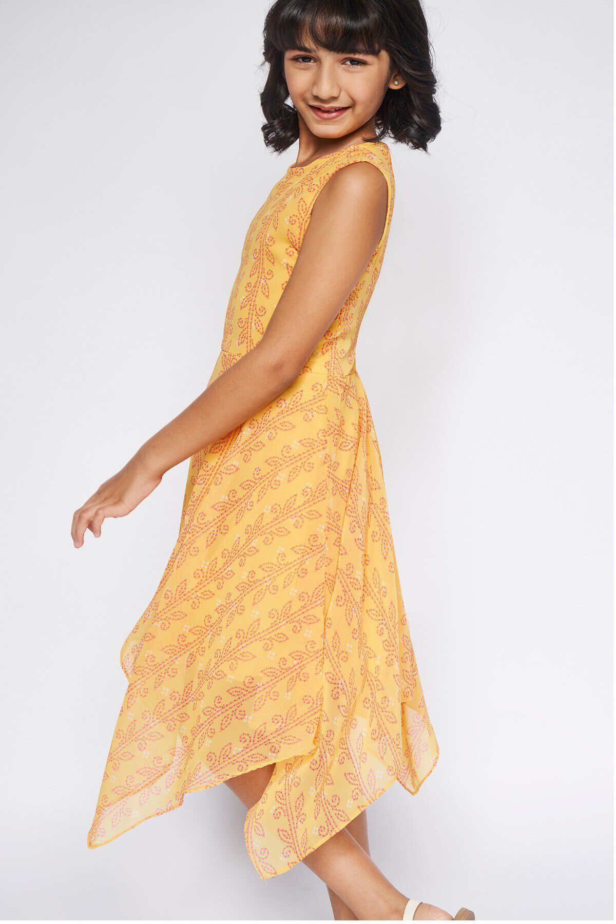 Keep getting ready for a festive party fuss-free yet stylish with this printed dress for girls from Global Desi. In Bandhani print, this sleeveless dress features an asymmetrical flared hemline. Pair this elegant dress with a dainty gold necklace and colour coordinating ethnic footwear.