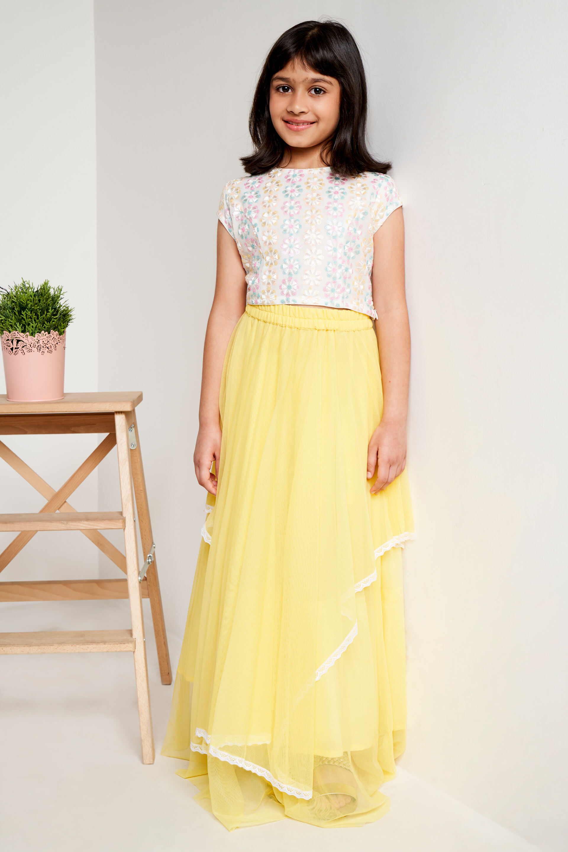 Make your little darling look like an angel at the next festive or wedding party in this two-piece set for girls from Global Desi. This elegant set comprises a cute crop top with cap sleeves made from rich embroidered fabric and an asymmetrical skirt made from soft tulle fabric and lace running through the hemline in an eye-catching shade of yellow. Stylise this ensemble with delicate diamond jewellery and comfortable ethnic footwear.