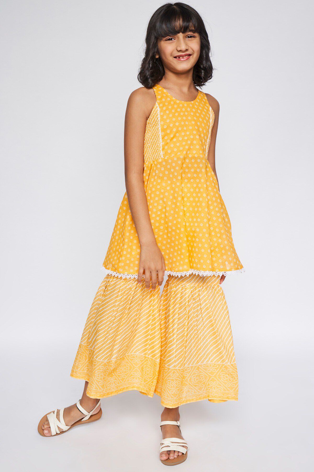 Perfect for a festive day is this chic and eminently stylish two-piece kurta set for girls from Global Desi. Crafted from the finest cotton fabric, this set comprises a fit and flare sleeveless kurta featuring a Bandhini print and a smocked bodice. The bottom is a sharara in a leheriya print. Elevate this ensemble with ethnic earrings and juttis.